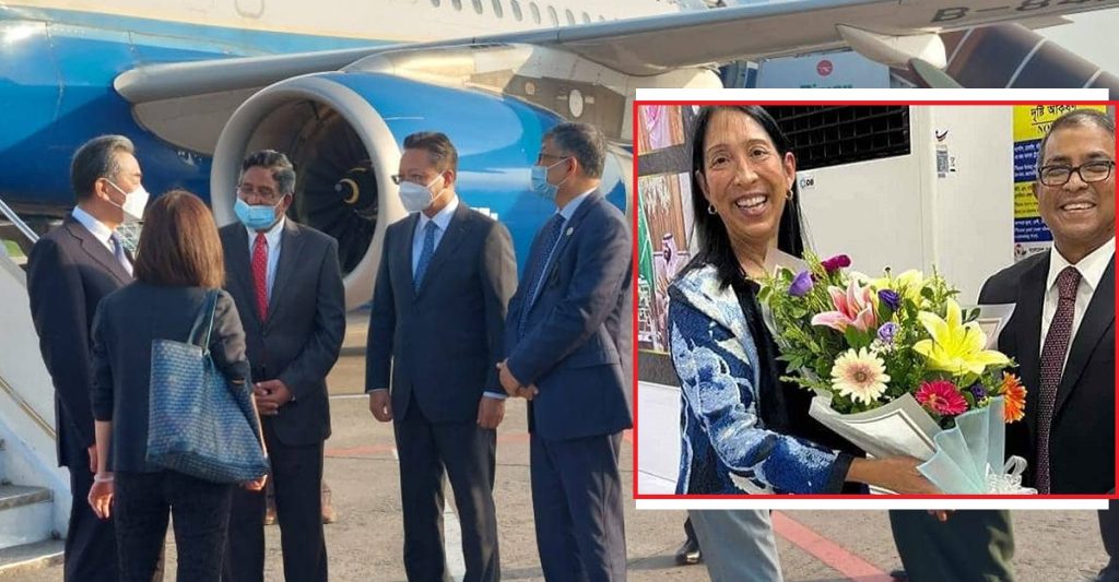 কূটনৈতিক রিপোর্টার : শনিবার দুই দিনের সফরে ঢাকায় এসে পৌঁছেছেন চীনের পররাষ্ট্রমন্ত্রী ওয়াং ই। ওদিকে চার দিনের সফরে ঢাকায় এসেছেন মার্কিন পররাষ্ট্র দপ্তরের আন্তর্জাতিক সংস্থা বিষয়ক সহকারী মন্ত্রী মিশেল জে সিসন। চীনের পররাষ্ট্রমন্ত্রী ওয়াং ই আসার ঘণ্টাখানেক পর শনিবার সন্ধ্যা ৬টার দিকে ঢাকায় পা রাখেন সিসন।ক্ষমতার দৃশ্যপটে একদিকে চীন অন্যদিকে আমেরিকা। কোনদিকে যাবে ঢাকা! তা সময়েই বলে দেবে।
