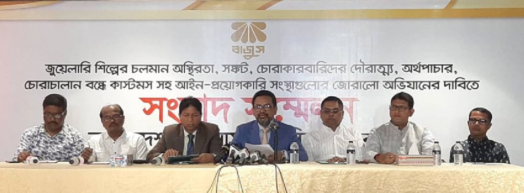 বিশেষ প্রতিনিধি : প্রতিদিন ২০০ কোটি টাকার গোল্ড স্মাগলিং হচ্ছে বাংলাদেশে। চোরাচালানের মাধ্যমে প্রতিদিন অবৈধভাবে এসব সোনা দেশে আসছে। বছরে যার অংক দাঁড়ায় ৭৩ হাজার কোটি টাকা। যার পুরোটাই প্রতিবেশি দেশগুলোতে পাচার হয়ে যাচ্ছে বলে দাবি করেছে বাজুস বাংলাদেশ জুয়েলার্স অ্যাসোসিয়েশন (বাজুস)। শনিবার (১৩ আগস্ট) সকালে রাজধানীর বসুন্ধরা সিটি শপিং মলে সোনা ব্যবসায়ীদের সংগঠনটির কার্যালয়ে এক সংবাদ সম্মেলনে এ তথ্য জানানো হয়। সংবাদ সম্মেলনে লিখিত বক্তব্য পাঠ করেন বাজুস স্ট্যান্ডিং কমিটি অন এন্টি স্মাগলিং অ্যান্ড ল’ এনফোর্সমেন্টের চেয়ারম্যান এনামুল হক খান দোলন। সারা দেশে জুয়েলারি শিল্পের বাজারে অস্থিরতা, চলমান সংকট ও সমস্যা, দেশি-বিদেশি চোরাকারবারি সিন্ডিকেটের দৌরাত্ম্য, অর্থপাচার ও চোরাচালান বন্ধ এবং কাস্টমসসহ সব আইন প্রয়োগকারী সংস্থাগুলোর জোরালো অভিযানের দাবিতে এ সংবাদ সম্মেলন করা হয়।