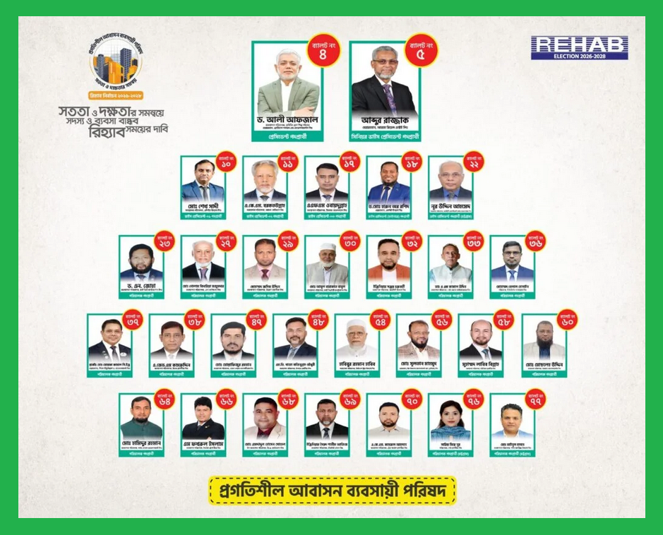 নির্বাচনে প্যানেল প্রধান প্রেসিডেন্ট পদপ্রার্থী ড. আলী আফজাল দৈনিক সত্যকথা প্রতিদিন কে বলেন, আমরা নির্বাচিত হলে সততা ও দক্ষতার সমন্বয়ে একটি ঐতিহাসিক রিহ্যাব গঠন করবো; যা আগে কেউ ভাবেনি। তিনি বলেন প্রগতিশীল পরিষদ রিহ্যাব এর ঘুনে ধরা খোলসটাই পাল্টে দেবে। তিনি বলেন, নির্বাচিত হলে প্রগতিশীল পরিষদ রিহ্যাব ভবন ছাড়াও বিহ্যাব বিশ্ববিদ্যালয় গঠনেরও প্রত্যয় ব্যক্ত করেন।